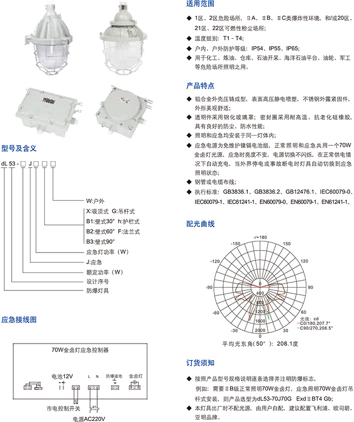 產品中心 防爆燈具 dL53-70J70/100J100系列防爆應急照明兩用燈(ⅡB、ⅡC、DIP)
