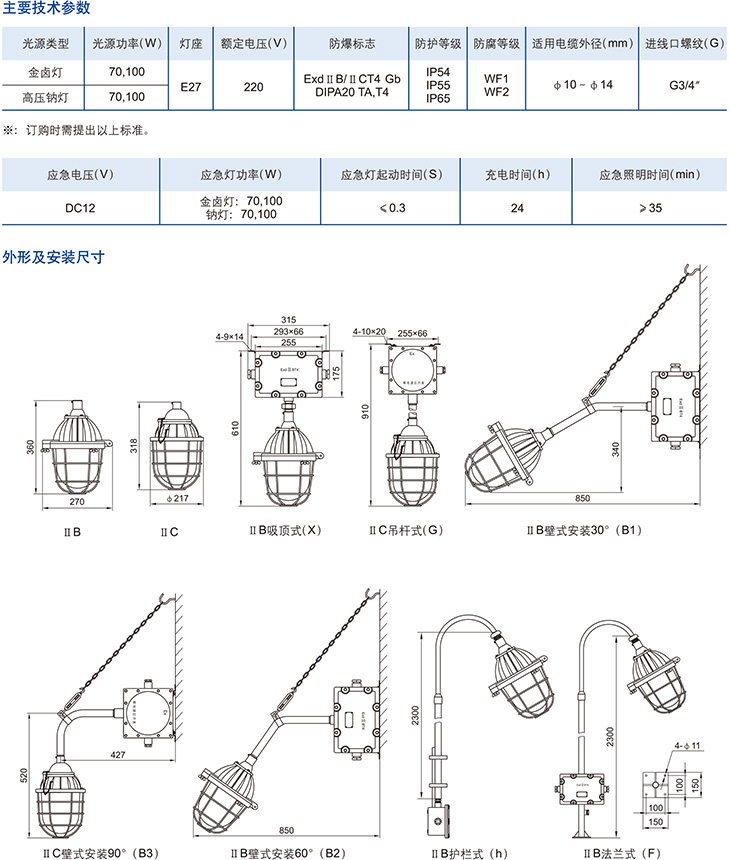 dL53-70J70/100J100系列防爆應急照明兩用燈(ⅡB、ⅡC、DIP)